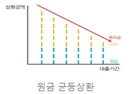 원금 균등상환 "대출원금을 매월 동일한 금액으로 갚아가는 방식" 으로 남은 대출원금에 대해 이자가 계산되어, 매월 납입하시는 상환 금액이 낮아지게 됩니다. 원금을 바로 갚아나가는 즉시 분할 상환 방식 과 일정 기간 이지만 납부 후 원금을 갚아나가는 거치식 분할 상환 방식이 있습니다.
